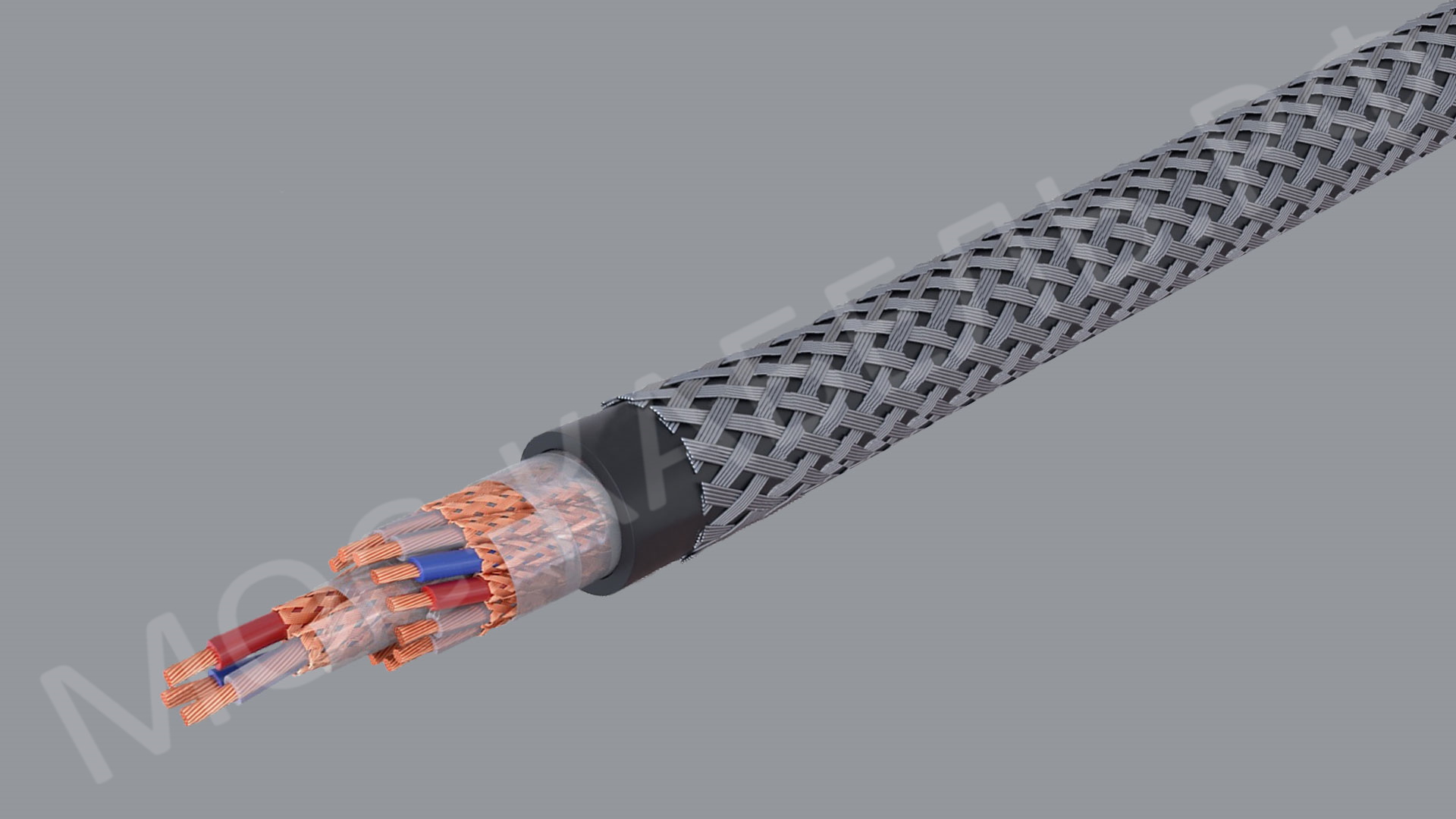 Поверх оболочки наложена панцирная оплетка из проволок: из стальных нержавеющих проволок.